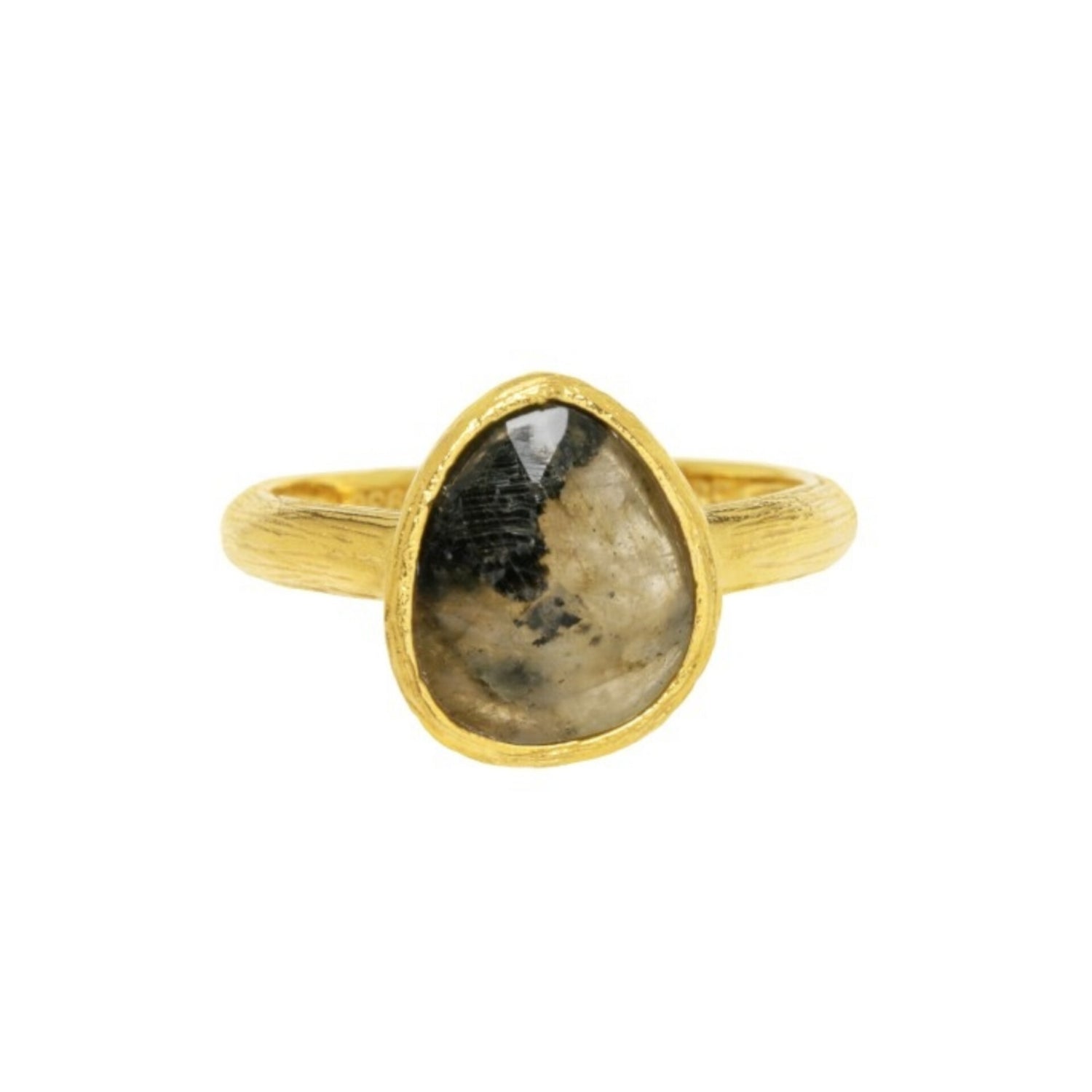 El Anillo Aura, elaborado en plata de ley con baño de oro de 18 quilates, enmarca una labradorita natural tallada en forma libre.