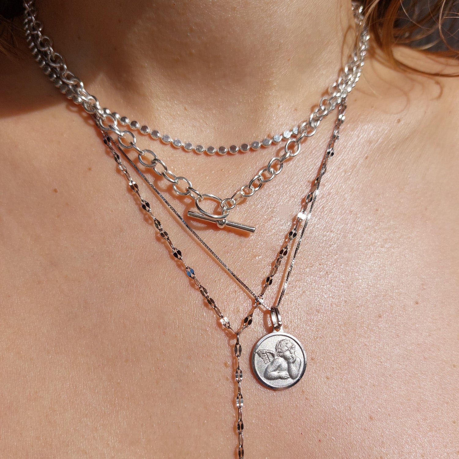 Sus eslabones redondeados y regulares aportan volumen y presencia, mientras el cierre en T se convierte en un detalle protagonista que puedes lucir al frente o en un lateral. Fabricada en plata de ley 925, es una pieza versátil que puedes llevar sola como declaración de fuerza o combinada con tus talismanes Laforce para un look lleno de significado.