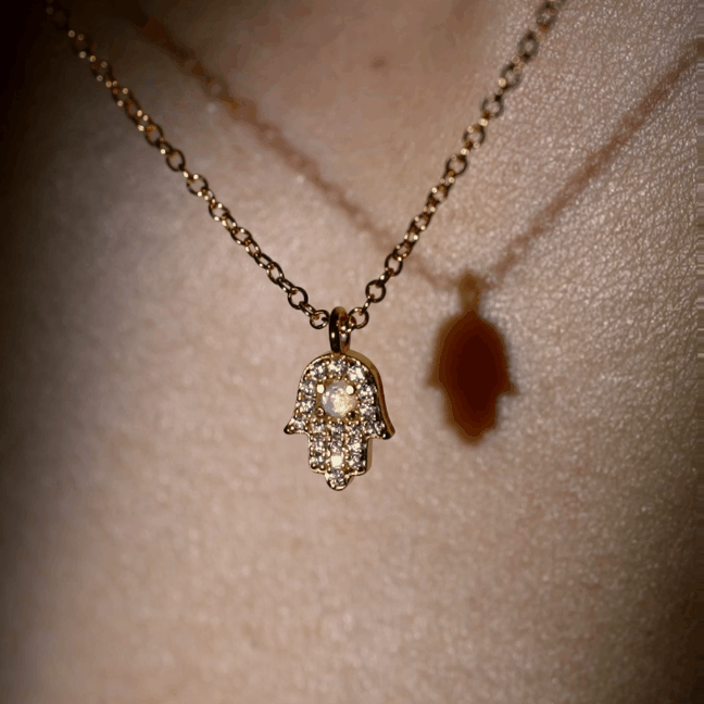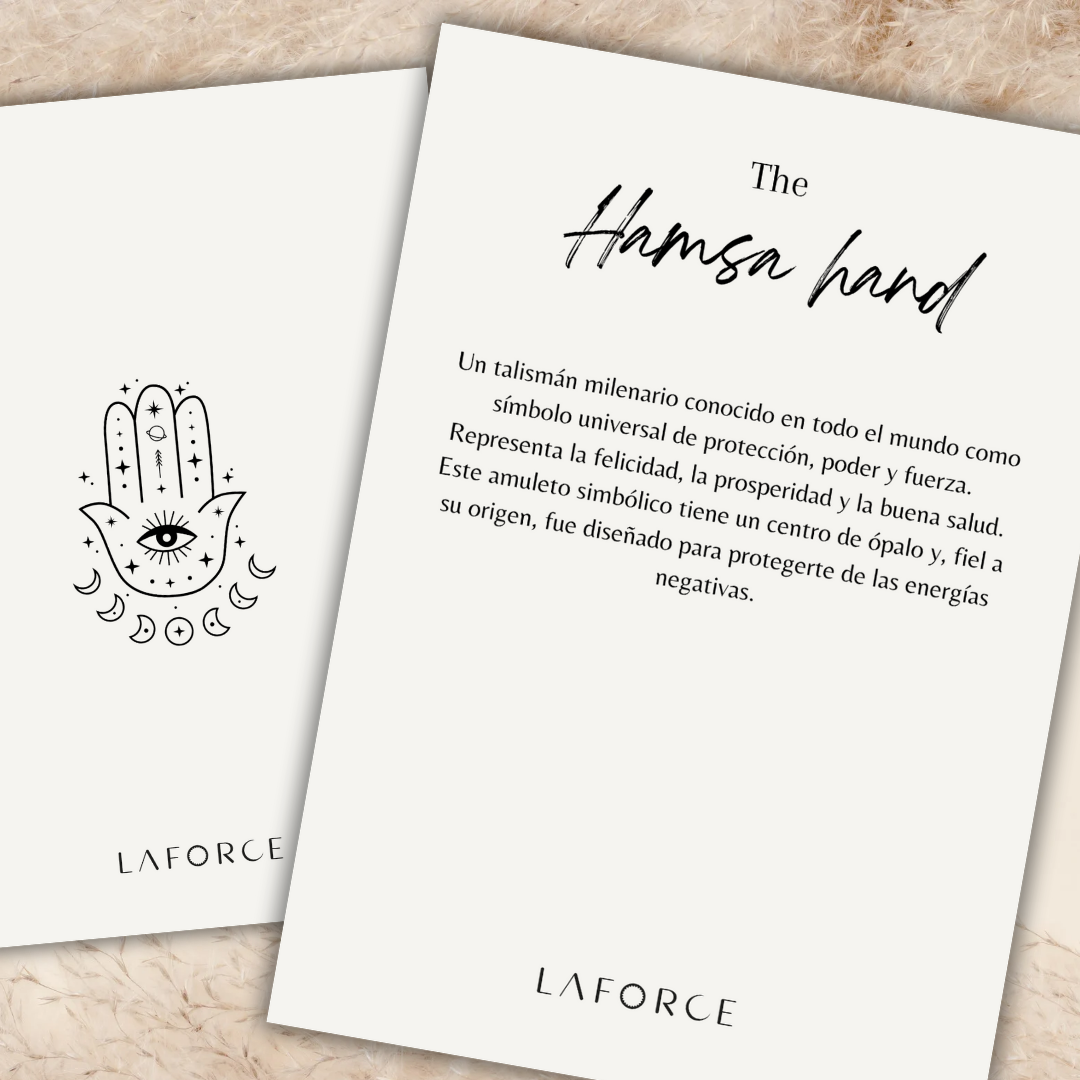Este collar representa a la mano de Hamsa, un símbolo ancestral utilizado durante siglos como amuleto de protección, fuerza espiritual y bienestar.