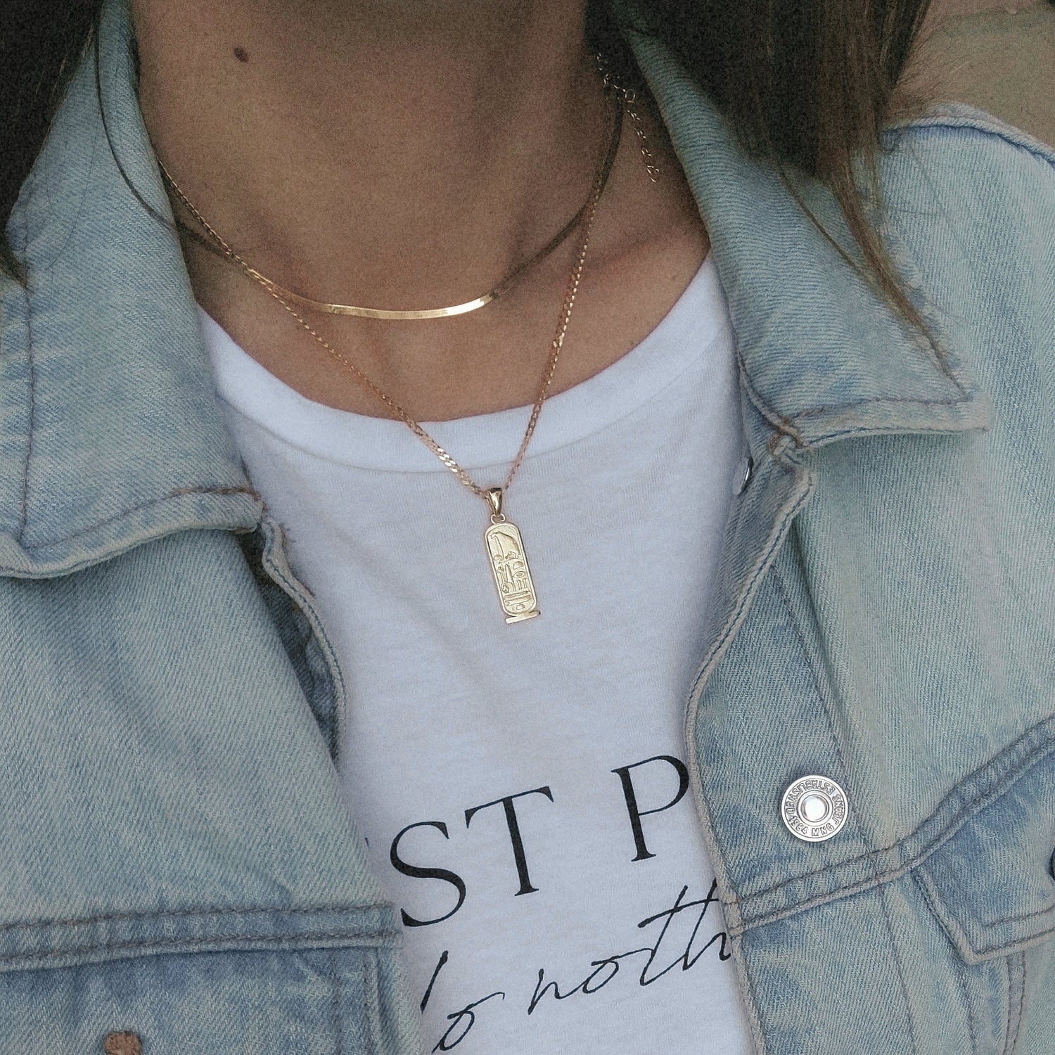Los jeroglíficos egipcios grabados representan amor, fortaleza, alegría y protección.